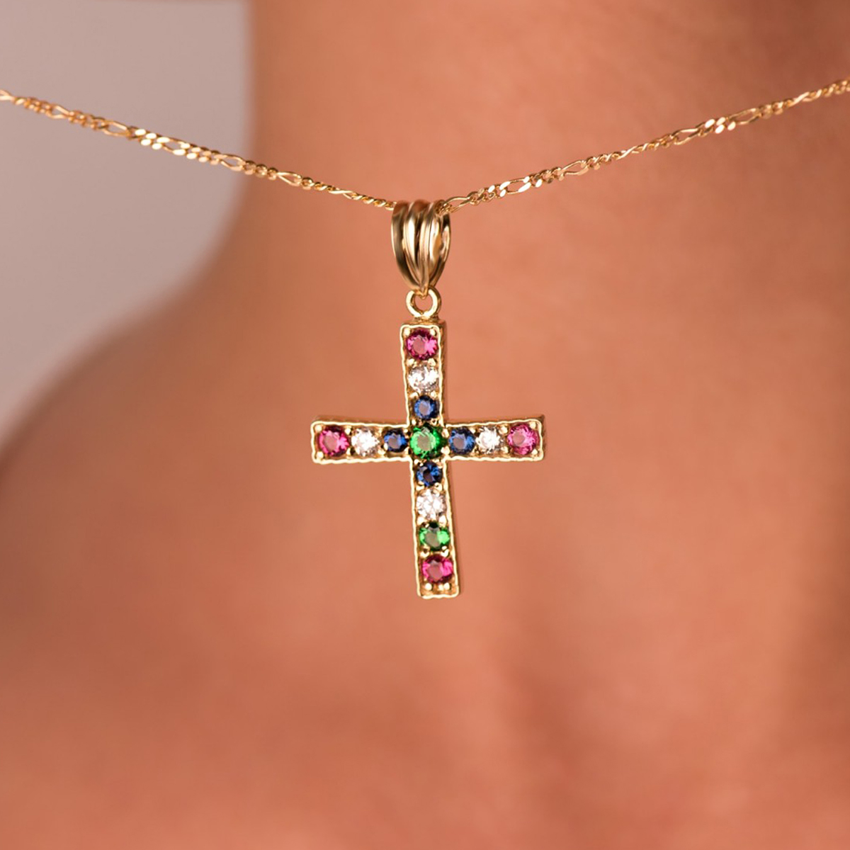 Stunning piece that combines faith and vibrant style, this 18-karat yellow gold cross is adorned with a beautiful array of round, multi-colored zirconias. The colorful stones are set across the entire surface of the cross, creating a dazzling and eye-catching effect. Measuring 22 x 19 mm, this pendant is a perfect way to express your faith with a modern and brilliant twist.
