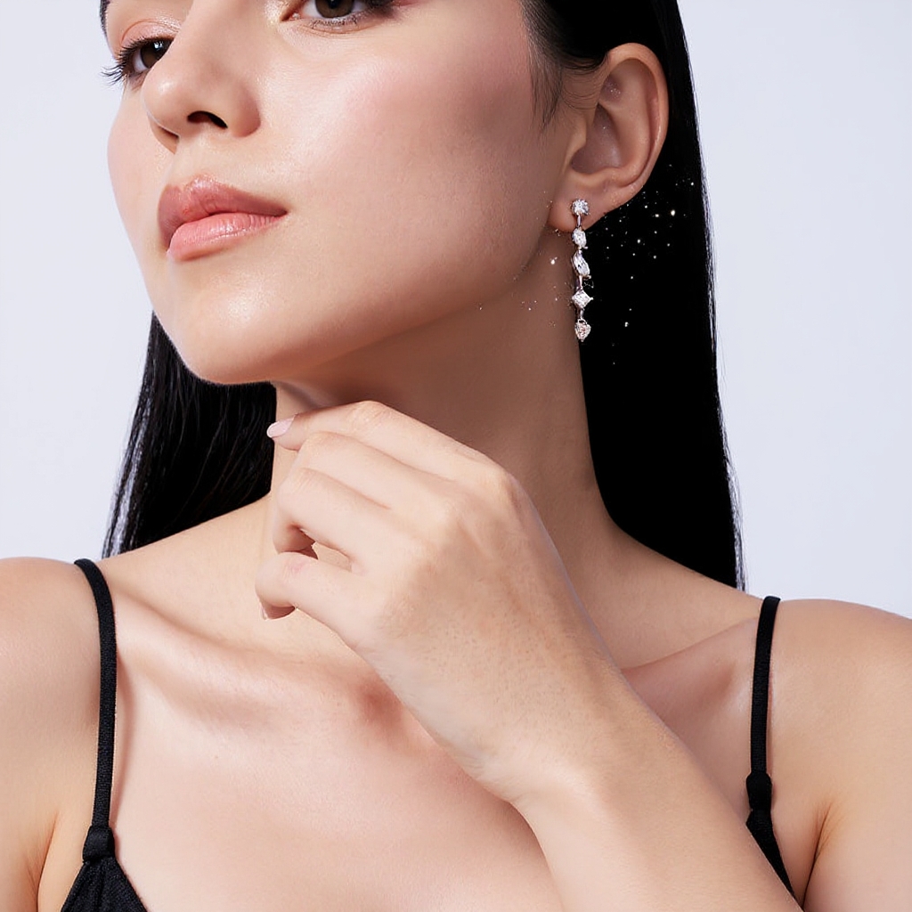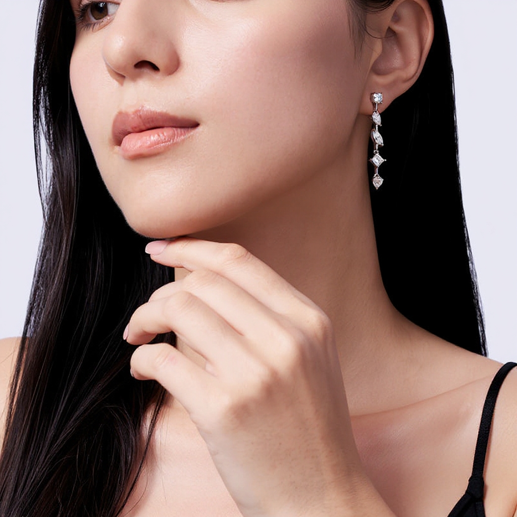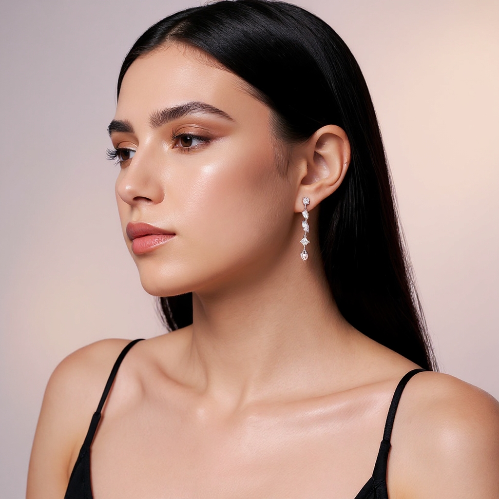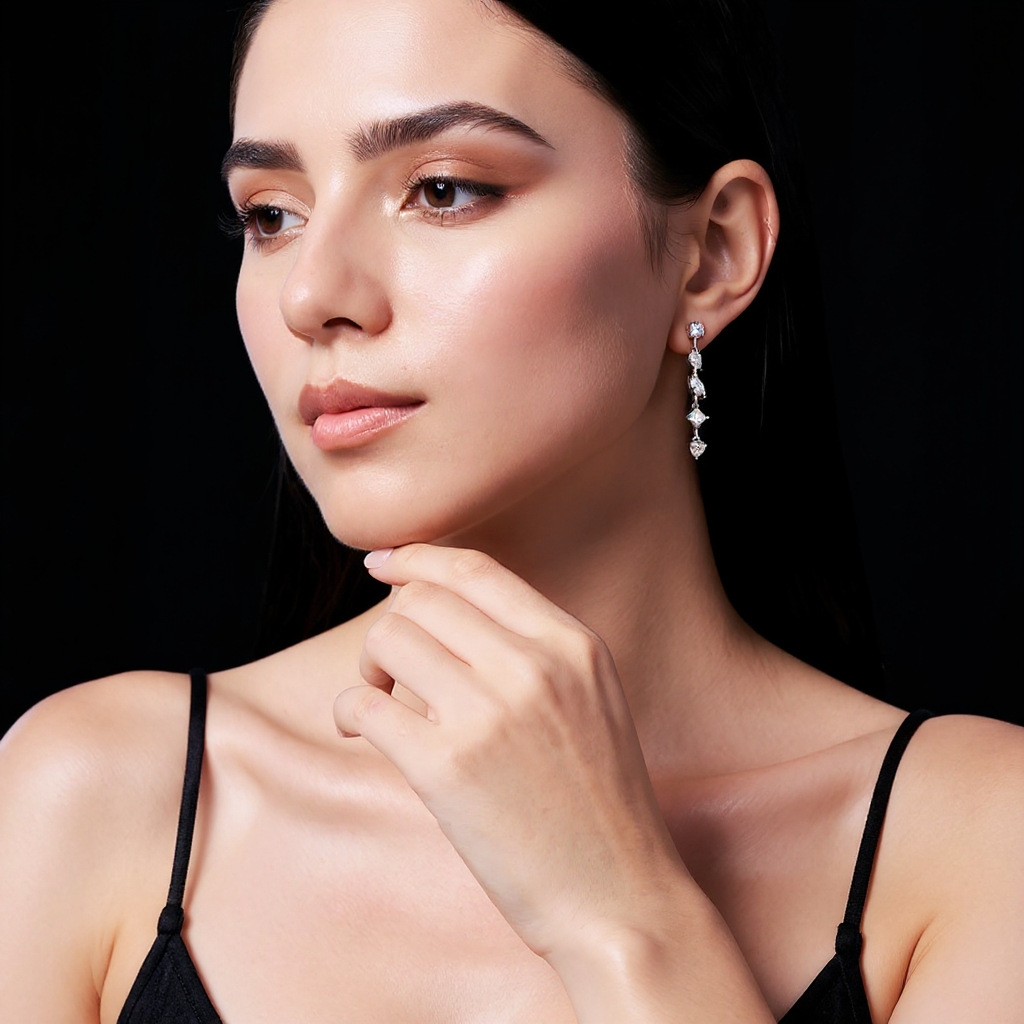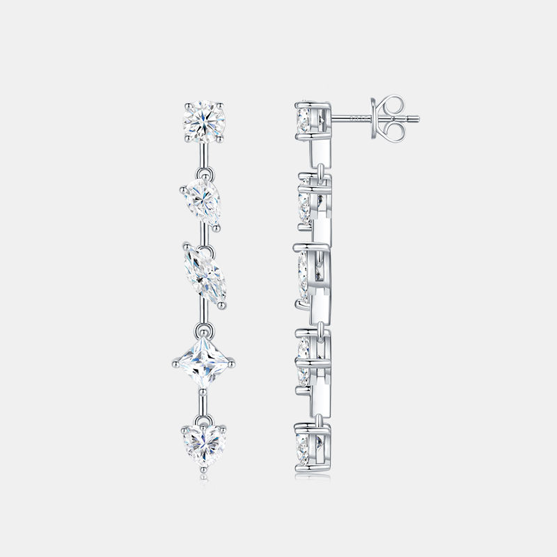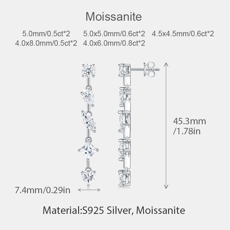 Capturing the essence of modern luxury and rhythmic light. These exquisite long-drop earrings are a masterclass in geometric brilliance, featuring a curated sequence of five distinct Moissanite cuts. Designed for the woman who seeks a bold, contemporary statement, these earrings create a mesmerizing "waterfall" effect that dances with every movement. Each earring is meticulously crafted from genuine 925 Sterling Silver and finished with a durable Rhodium plating, which ensures a high-polish, tarnish-resistant shine that maintains its breathtaking white color.