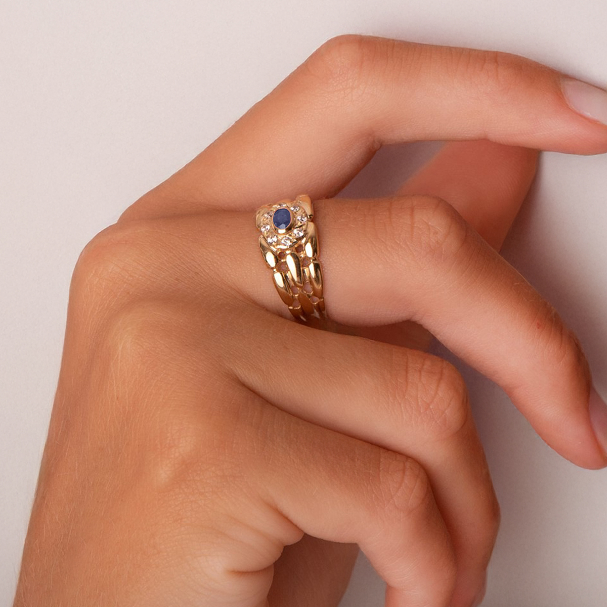 This luxurious 18-karat yellow gold "panther" ring showcases a deep blue natural sapphire (4 x 3 mm), beautifully complemented by an encircling halo of sparkling zirconias. The robust gold setting and rich gemstones combine for an eye-catching and sophisticated design.