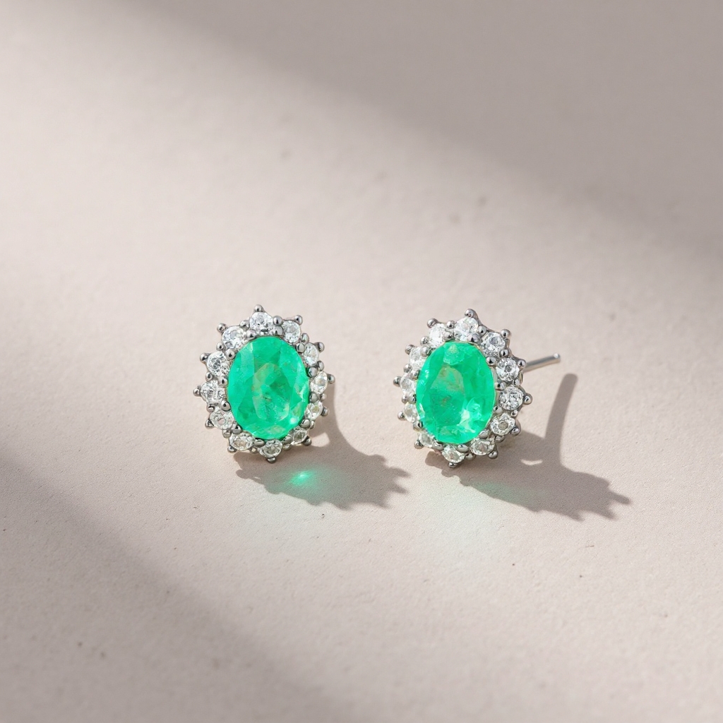Our Royal earrings feature a dazzling emerald-coloured centre stone (8x6 mm) surrounded by a halo of small zirconia stones (Ø2 mm) that provide exceptional sparkle. Perfect for adding a touch of distinction to any style. Each earring is meticulously crafted from genuine 925 Sterling Silver and finished with a durable Rhodium plating, which ensures a high-polish, tarnish-resistant shine that maintains its breathtaking white color.