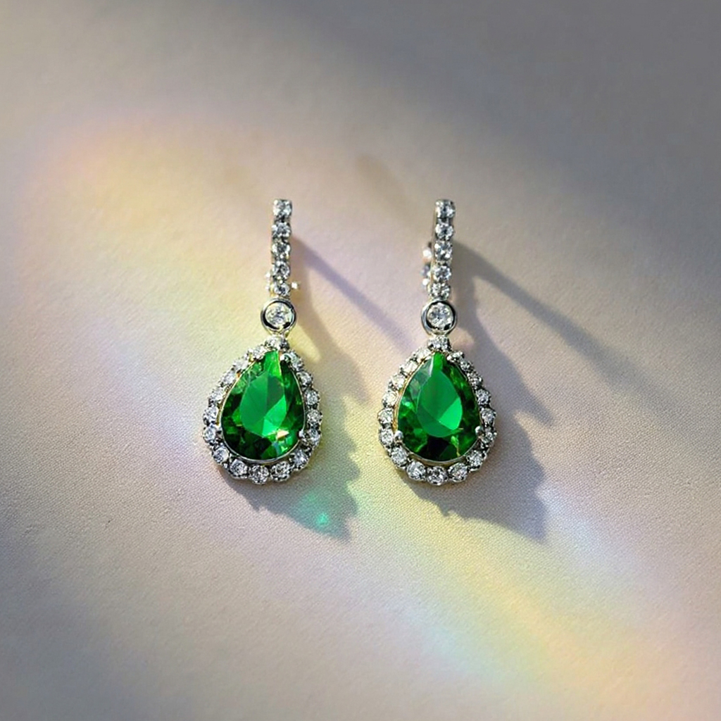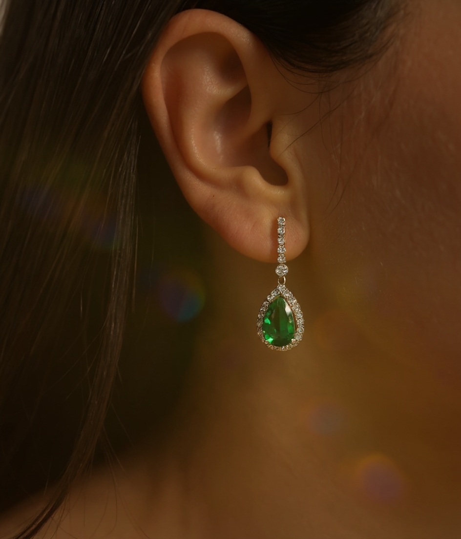 18k white gold dangle earrings. They feature a two-part design with a teardrop-shaped green stone at the bottom (12 x 8 mm), which is surrounded by a halo of smaller brilliant zirconias. The top section consists of a circular stud and a line of bezel-set stones. The earrings measure 33x12 mm and are secured with a push-back clasp.