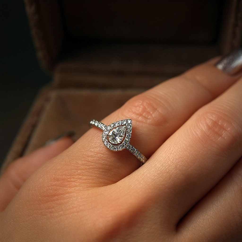 The Wonder Ring is an elegant white gold diamond ring designed to celebrate valuable moments. Its unique pear-shaped center diamond, creates a striking contrast with its sharp tip and smooth curve, amplified by a dazzling pavé halo. This versatile ring, perfect for everyday wear or as an engagement piece, boasts high-quality diamonds and a sleek design that elongates the hand.
